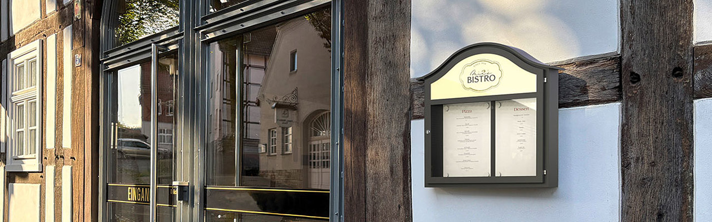In der Gastronomie entscheidet oft der erste Blick auf die Speisekarte im Schaukasten, ob der Gast das Lokal betritt. Die Art der Präsentation im Speisekartenkasten zeigt dabei auch, wie genau und korrekt es der Betrieb mit Feinheiten nimmt. Das lässt sich auf viele Branchen übertragen – ein Schaukasten bzw. Auslagekasten oder Infokasten wirkt wie eine Visitenkarte. Daher sollte man ihm bei der Auswahl die entsprechende Aufmerksamkeit schenken und sich für ein Modell mit ansprechendem Design und hoher Qualität entscheiden.