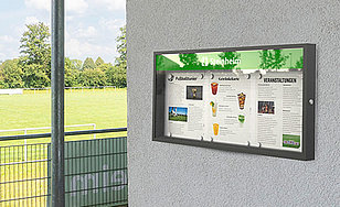 Die besondere Qualität unserer Schaukästen und Leuchten wird schon auf den ersten Blick deutlich: hochwertige Verarbeitung bis ins letzte Detail und korrosionsbeständige Materialien garantieren eine lange Lebensdauer und sorgen für einen überzeugenden Auftritt. Die Konstruktion ist besonders stabil und wirkt dabei filigran und zurückhaltend – damit Ihre Aushänge bestmöglich zur Geltung kommen. Dazu trägt auch die energiesparende LED-Beleuchtung bei, die bei einigen Modellen integriert ist. Wählen Sie zwischen den drei Standardfarben: Schwarz, Weiß und Anthrazit, Sonderfarben nach RAL sind auf Wunsch ebenfalls lieferbar. Auf Wunsch können wir das Logo Ihres Vereins oder Ihrer Einrichtung im Kopfbereich der Sichtscheibe aufdrucken. Damit wird der Schaukasten zum individuellen und repräsentativen Blickfang.