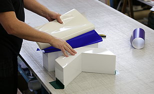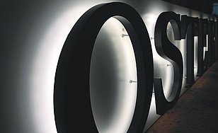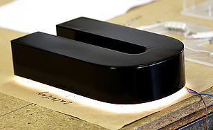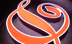Schattenschrift, Reliefbuchstabe aus Aluminium, Zwischenboden mit LEDs bestückt, indirekte Beleuchtung zur Wand (Korona-Effekt).